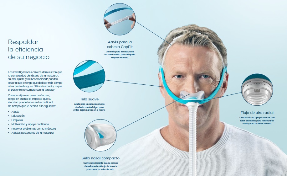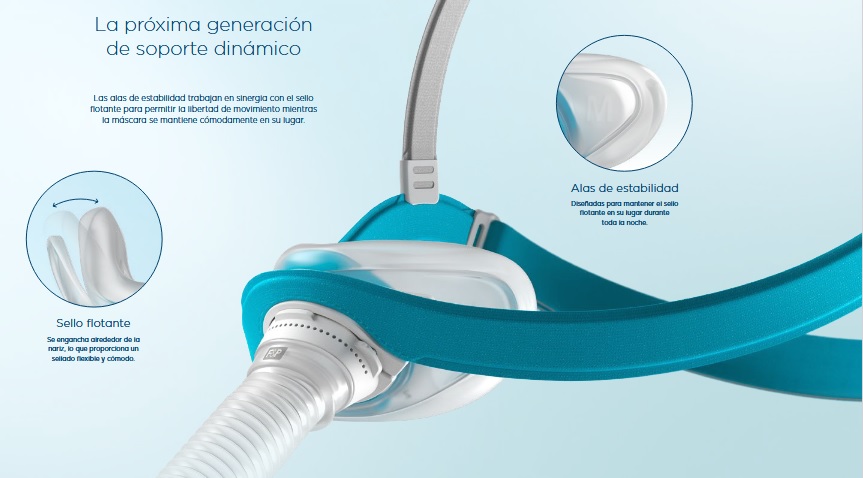 La estructura del arnés mantiene el sellado en la posición correcta en todo momento, lo que mejora la comodidad, reduce fugas y simplifica la experiencia tanto para el paciente como para el profesional de salud.
