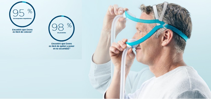 A diferencia de otras máscaras, F&P Evora™ incorpora el innovador arnés CapFit, diseñado para colocarse de forma tan simple como ponerse una gorra. Este sistema permite un ajuste rápido, intuitivo y familiar para el paciente, facilitando su uso desde la primera vez.